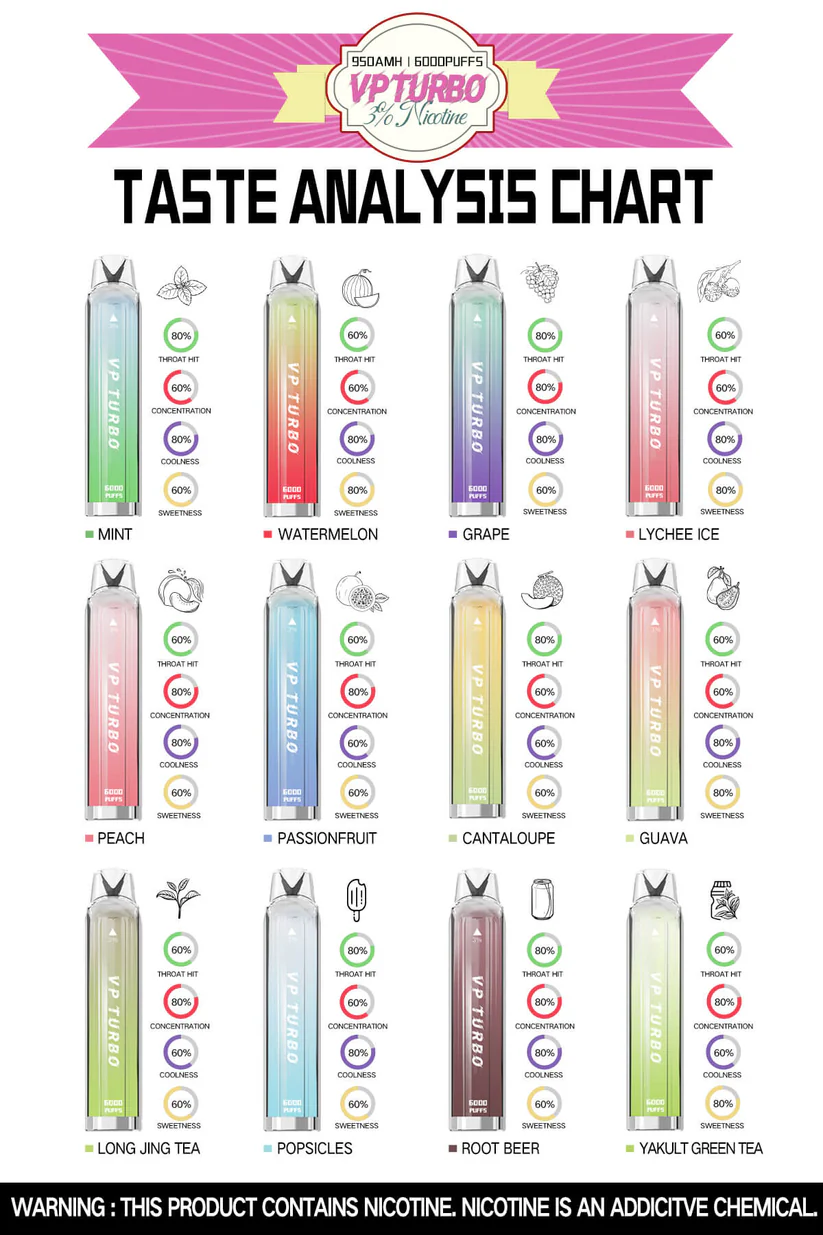 VP TURBO 6000口 是專為追求 高煙量、強續航、好口感 的用戶打造的拋棄式電子煙。內建 950mAh 大容量電池+6000 口超長抽數+Type-C 充電,一支抵多支,出門一支就夠。